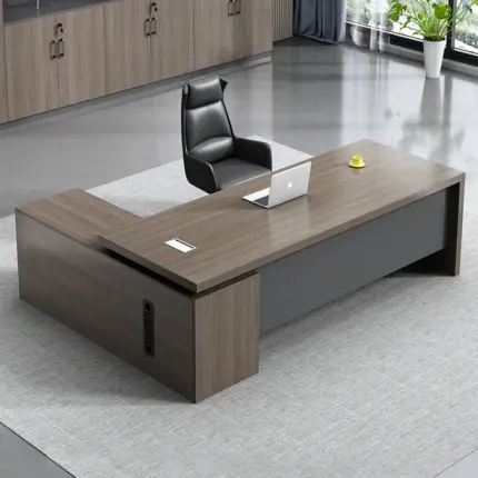 This 1.6-meter L-shaped executive office desk is designed to enhance workspace efficiency and professional aesthetics. With a modern dual-tone wood and graphite finish, the desk features an extended side cabinet, three integrated drawers, and cable management access, making it ideal for executive use in contemporary offices.