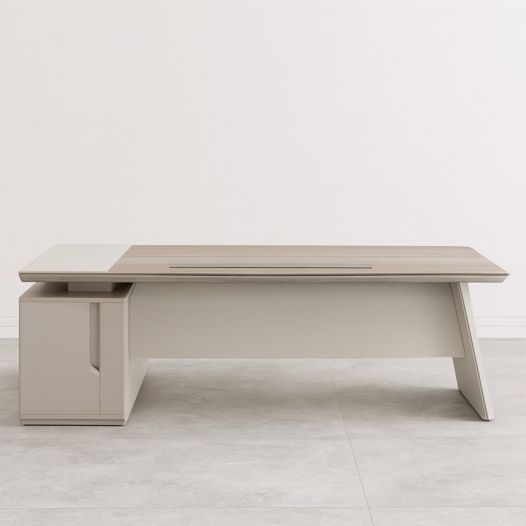Buy a 2.4M modern L-shaped executive desk in Kenya with a two-tone laminate top, integrated storage, cable management, and durable construction, ideal for offices, home workspaces, and boardrooms.