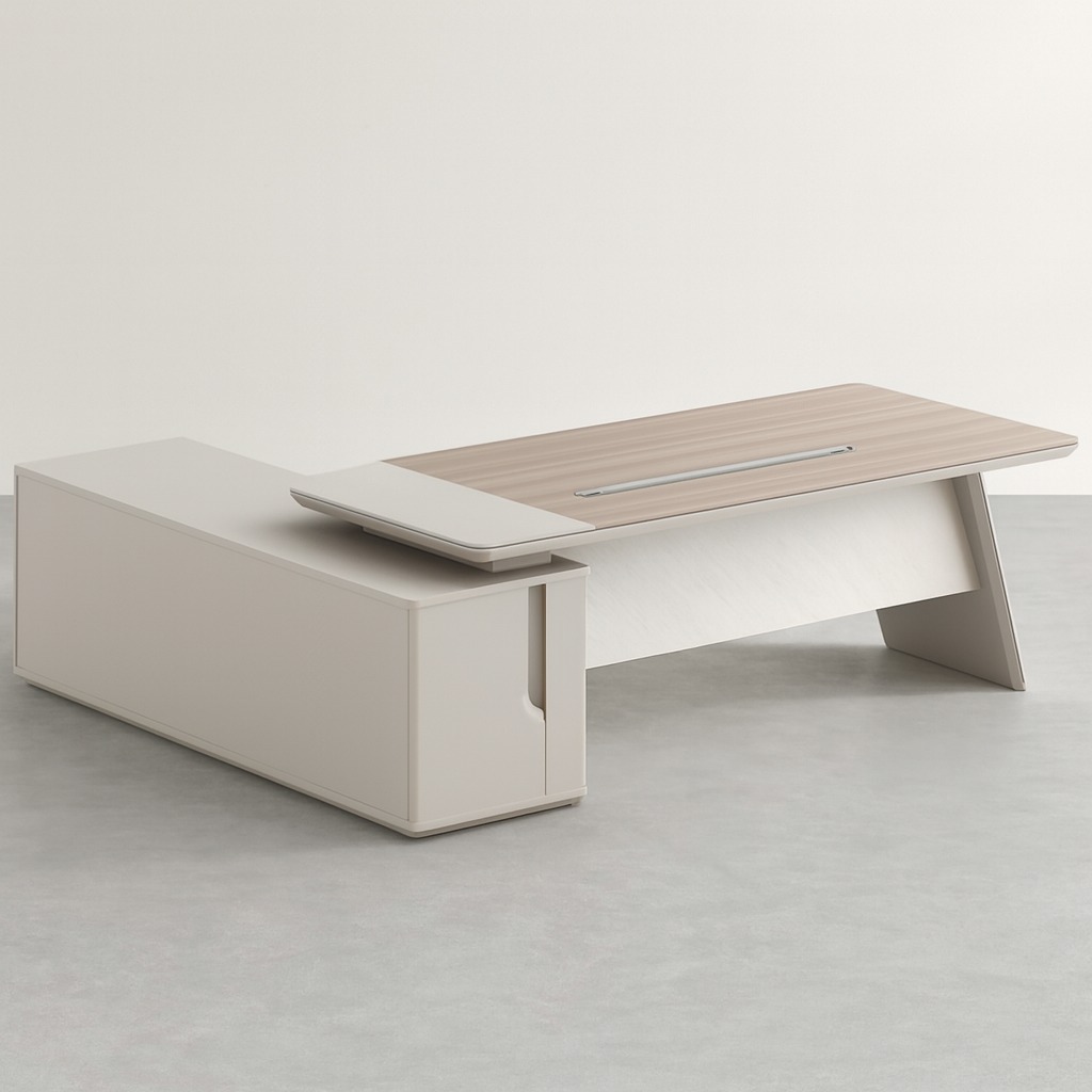 A sleek L-shaped executive desk designed for modern offices in Kenya, featuring a two-tone laminate finish in light grey and wood-grain, integrated storage, and an angular design suitable for efficient workspaces, boardrooms, or home offices.