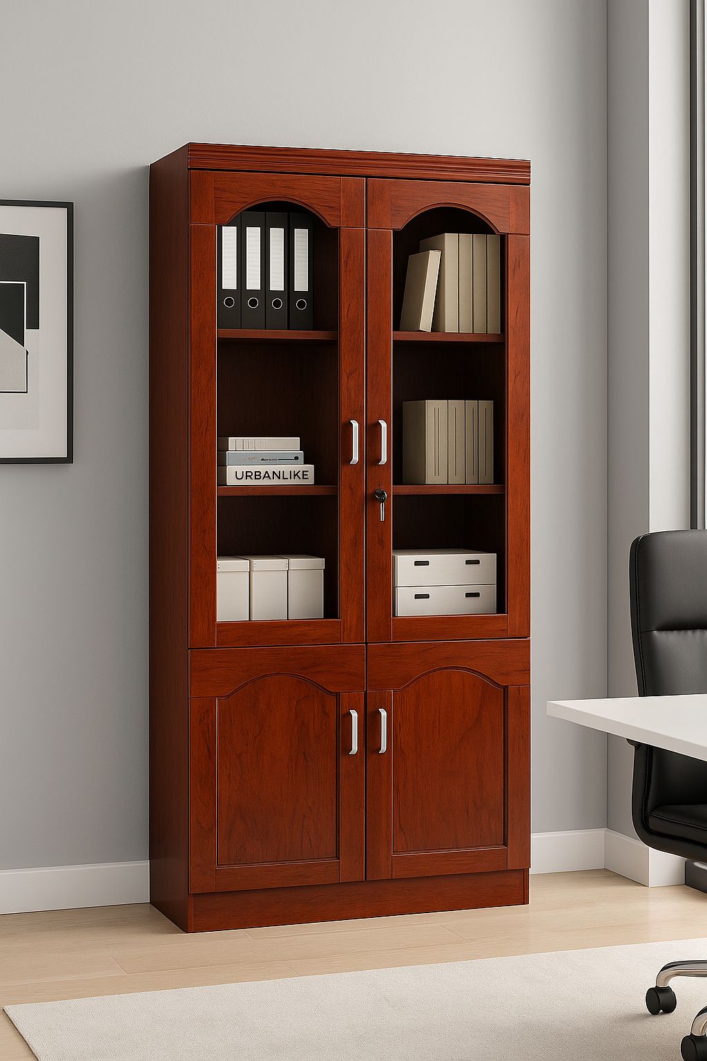 2-door wooden office cabinet features a classic woodgrain finish with glass-paneled upper doors and solid lower compartments, ideal for office filing, books, or display. The top section includes lockable glass doors for visibility and security, while the bottom half provides concealed storage for bulkier items.