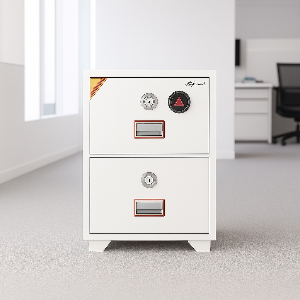 A compact fireproof filing cabinet with two lockable drawers, designed for secure document storage in offices, institutions, and records rooms.