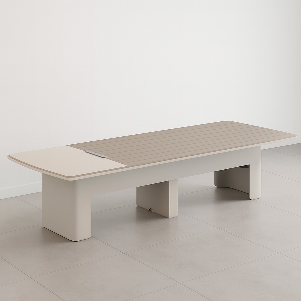 A contemporary executive conference table designed for meeting rooms and collaborative spaces in Kenya, featuring a two-tone laminate desktop, integrated cable management, and a sturdy build suitable for professional discussions and teamwork.