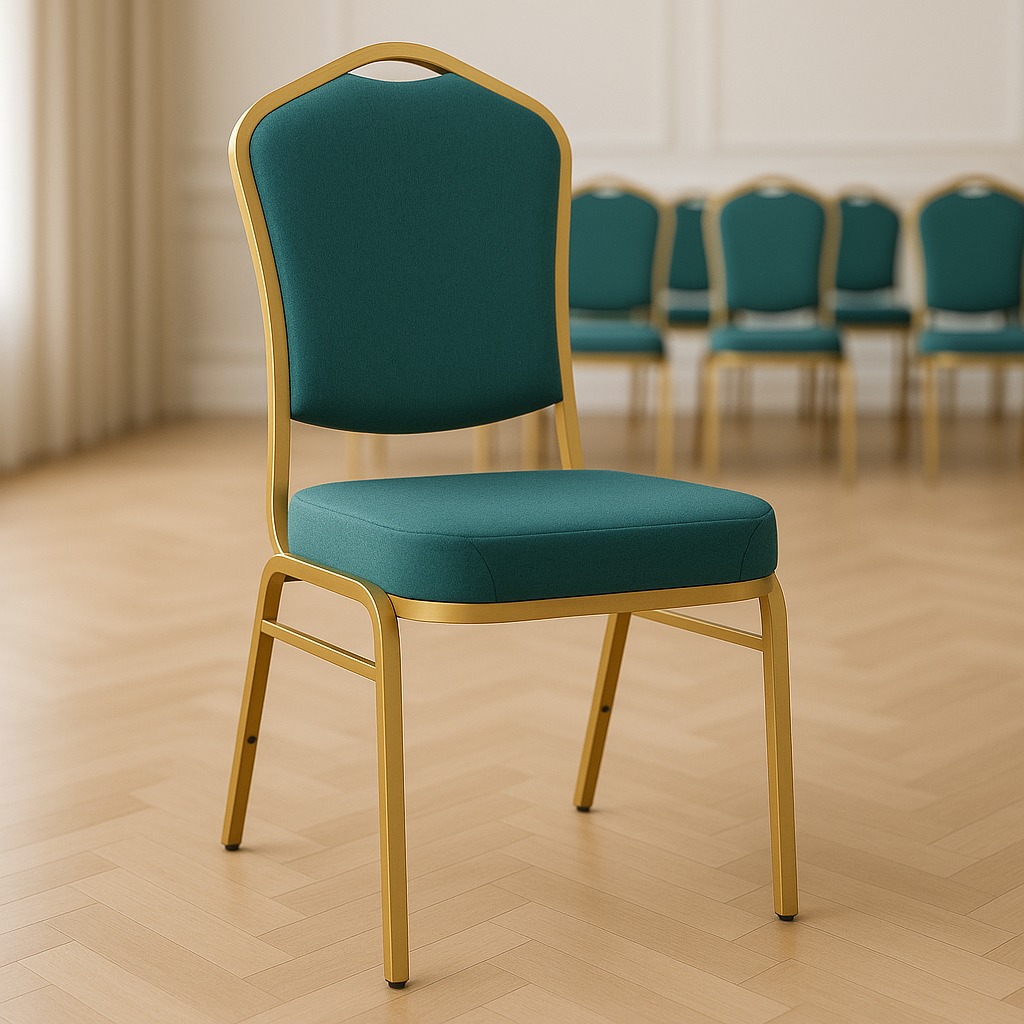 Buy Banquet Chair – Teal Fabric with Gold Frame, perfect for events, banquets, and conference seating in Kenya. Comfortable, stackable, and durable.