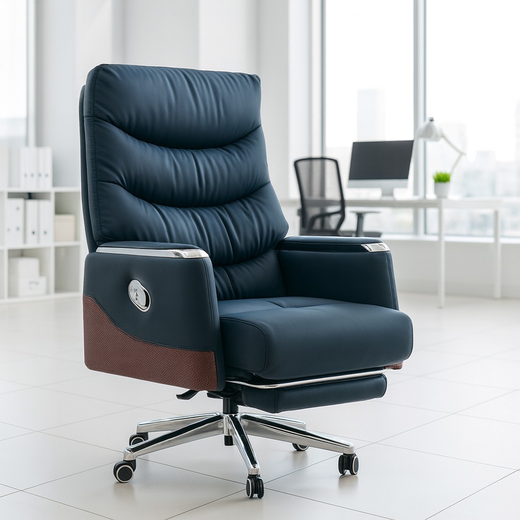 A high-back executive office chair designed for professional workspaces in Kenya, featuring deep padding, leather upholstery, reclining functionality, and a built-in footrest for extended seating comfort in executive and managerial offices.
