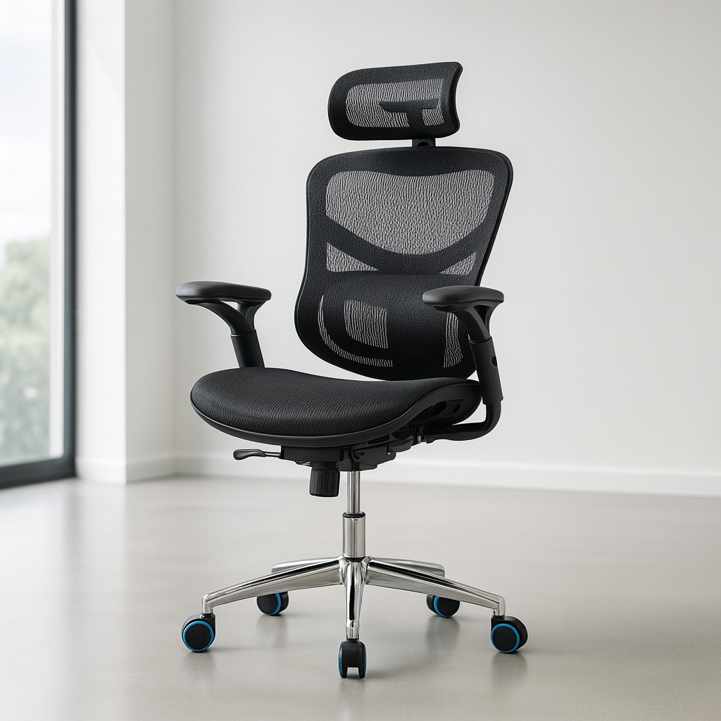 A breathable high-back swivel chair with adjustable headrest, lumbar contour and smooth-rolling chrome base—ideal for offices, studios, and home workspaces.