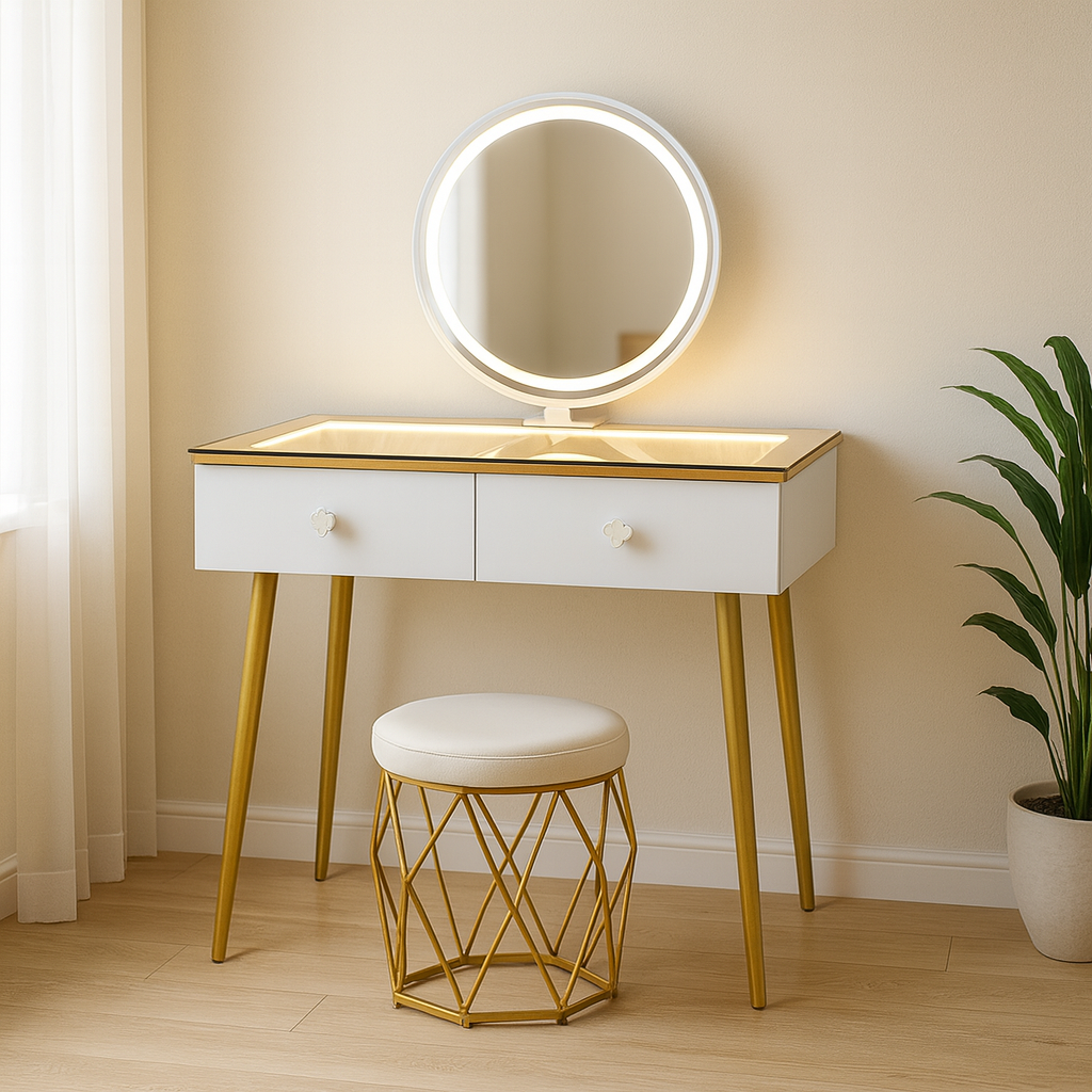 Buy an LED vanity dressing table in Kenya. 2 drawers, glass top, round lighted mirror, and matching stool—clean white/gold finish for compact bedroom grooming setups.