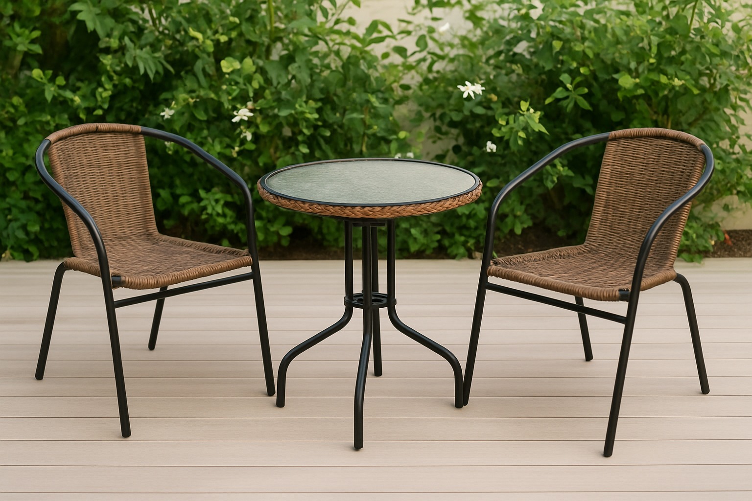 A stylish and compact outdoor patio set featuring two rattan chairs with a matching round glass-top table. Designed for durability and comfort, it is ideal for balconies, gardens, cafes, and small outdoor spaces.