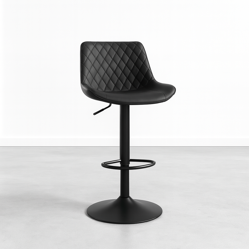 A modern adjustable bar stool featuring a quilted black upholstered seat and a sturdy pedestal base, suitable for kitchen counters, home bars, cafes, or commercial spaces in Kenya.