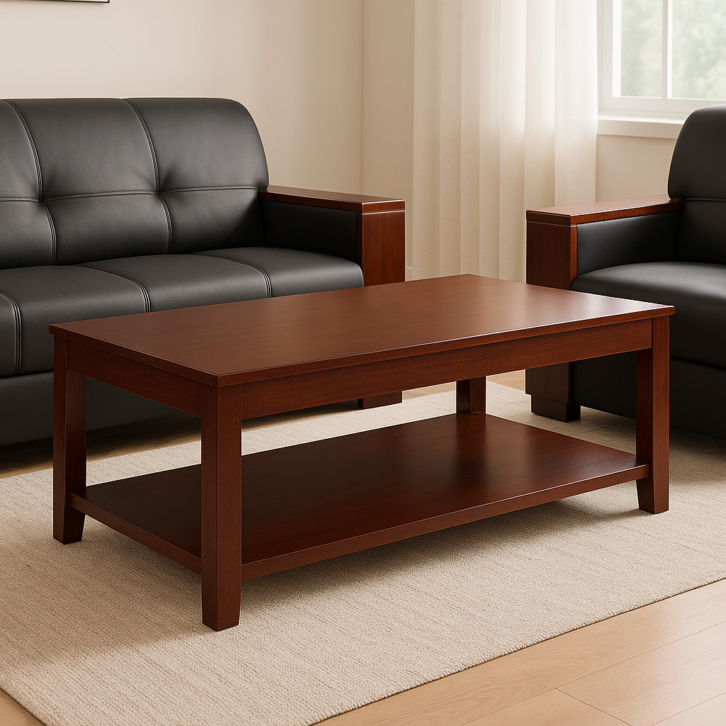 A classic rectangular coffee table with a rich mahogany finish, designed for both style and function. Ideal for office receptions, lounges, or living room settings.