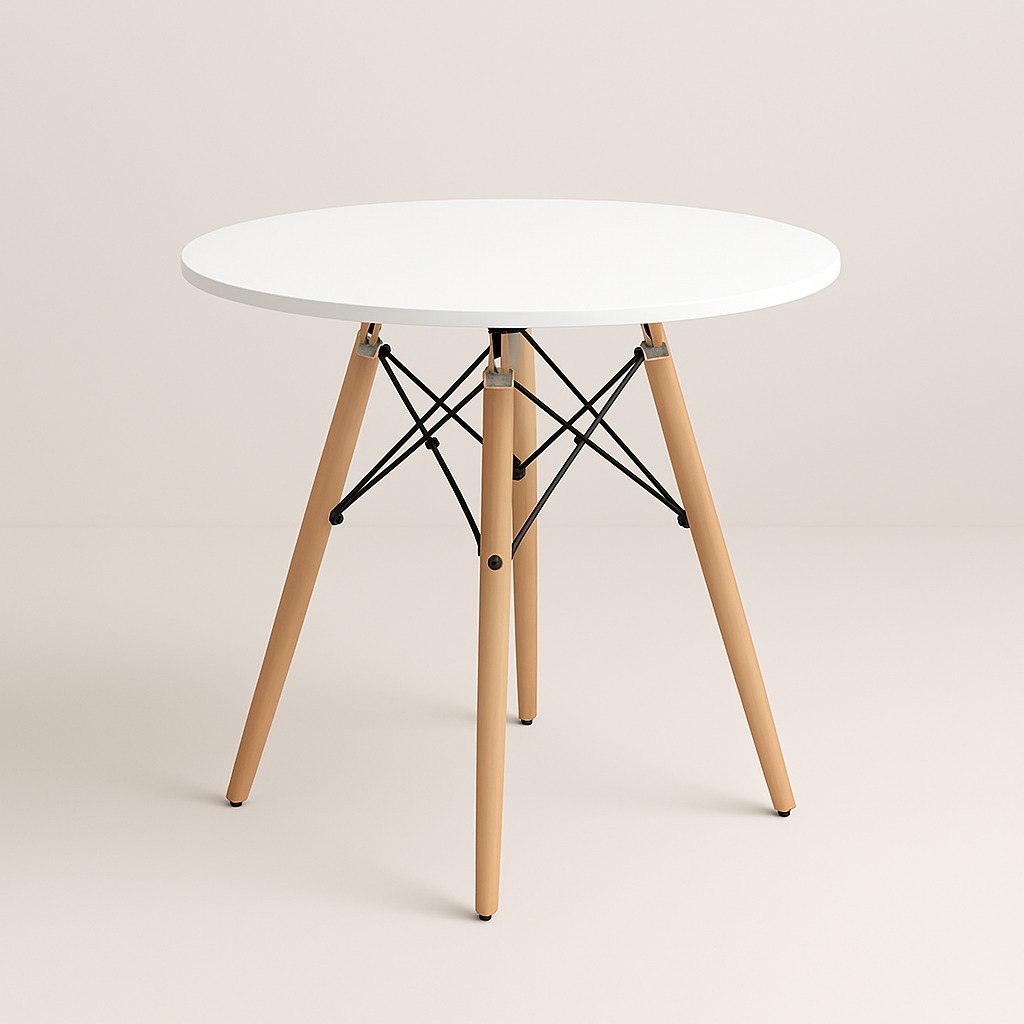Intro:A compact, modern round bistro table with a smooth white top and natural wooden legs—perfect for cafés, home dining corners, balconies, and reception refreshment spots.