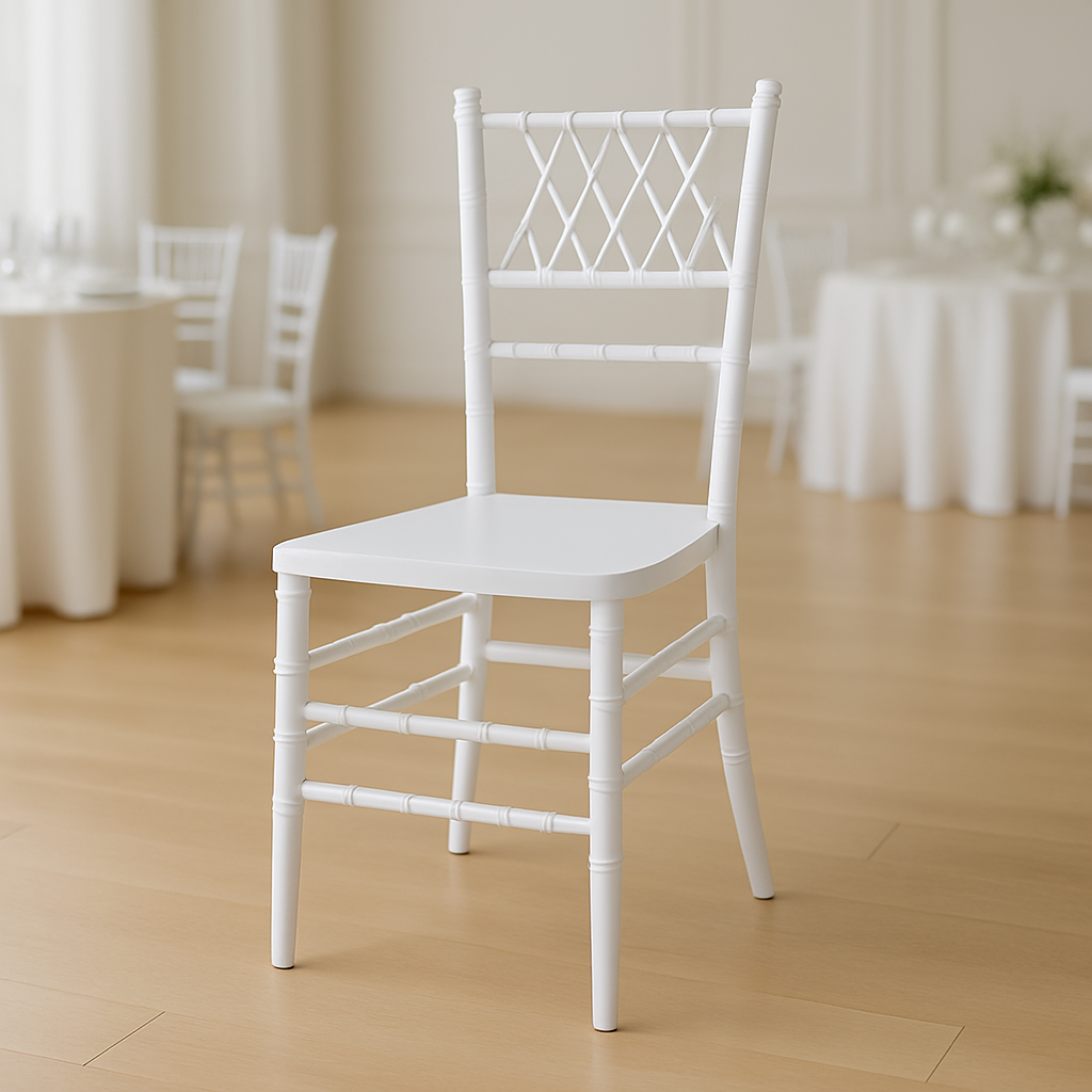 Tiffany event chairs in Kenya available in white and clear variants with spindle, phoenix, lattice, and ghost back designs. Durable, stackable, and perfect for weddings, receptions, and parties.